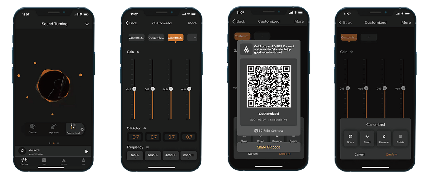 There are 3 EQ modes that can be selected---Dynamic, Pure, and Customized, which can be switched freely through the App. The user can also personalize the tones with EQ to get the exclusive sound effect. EQ settings can be shared with your friends.