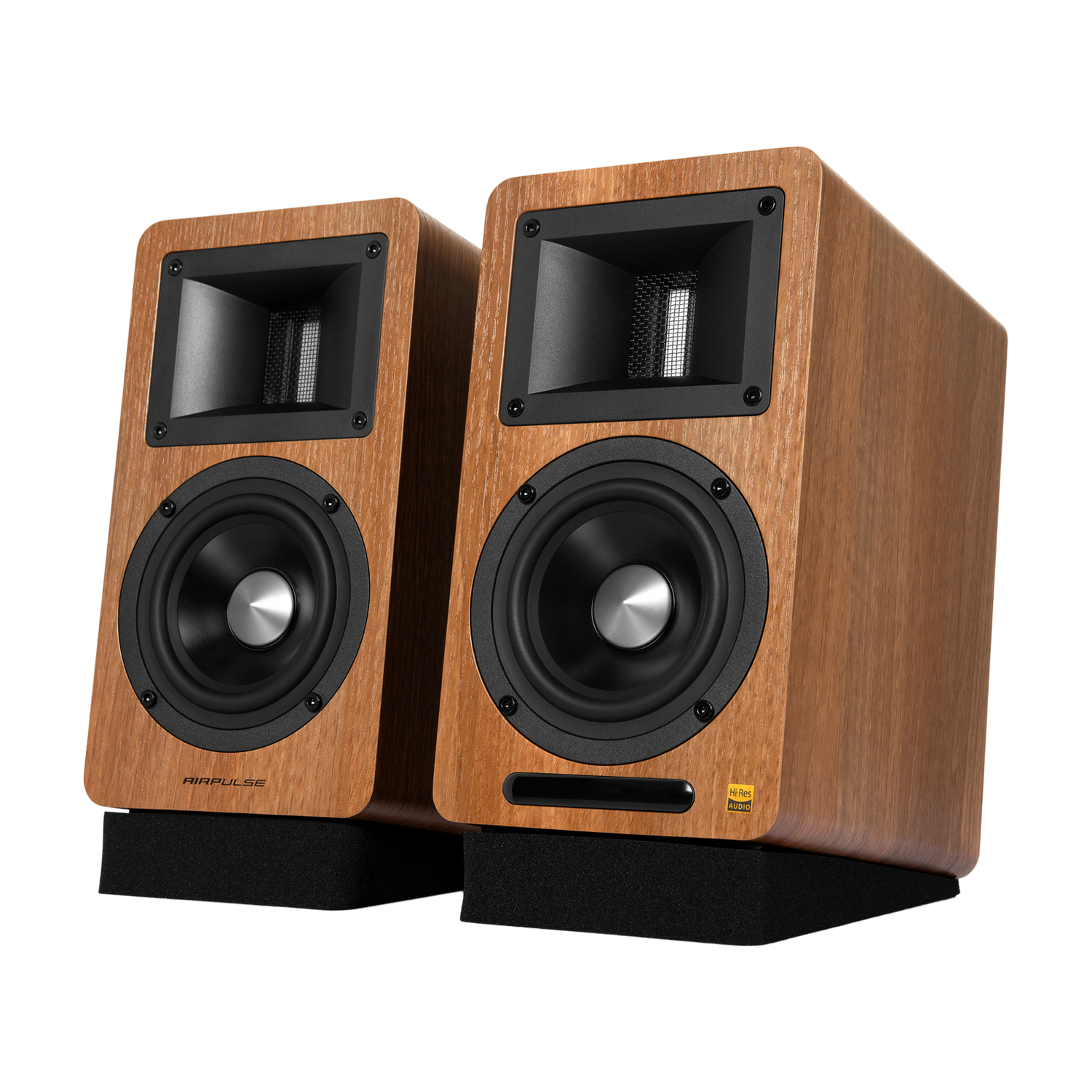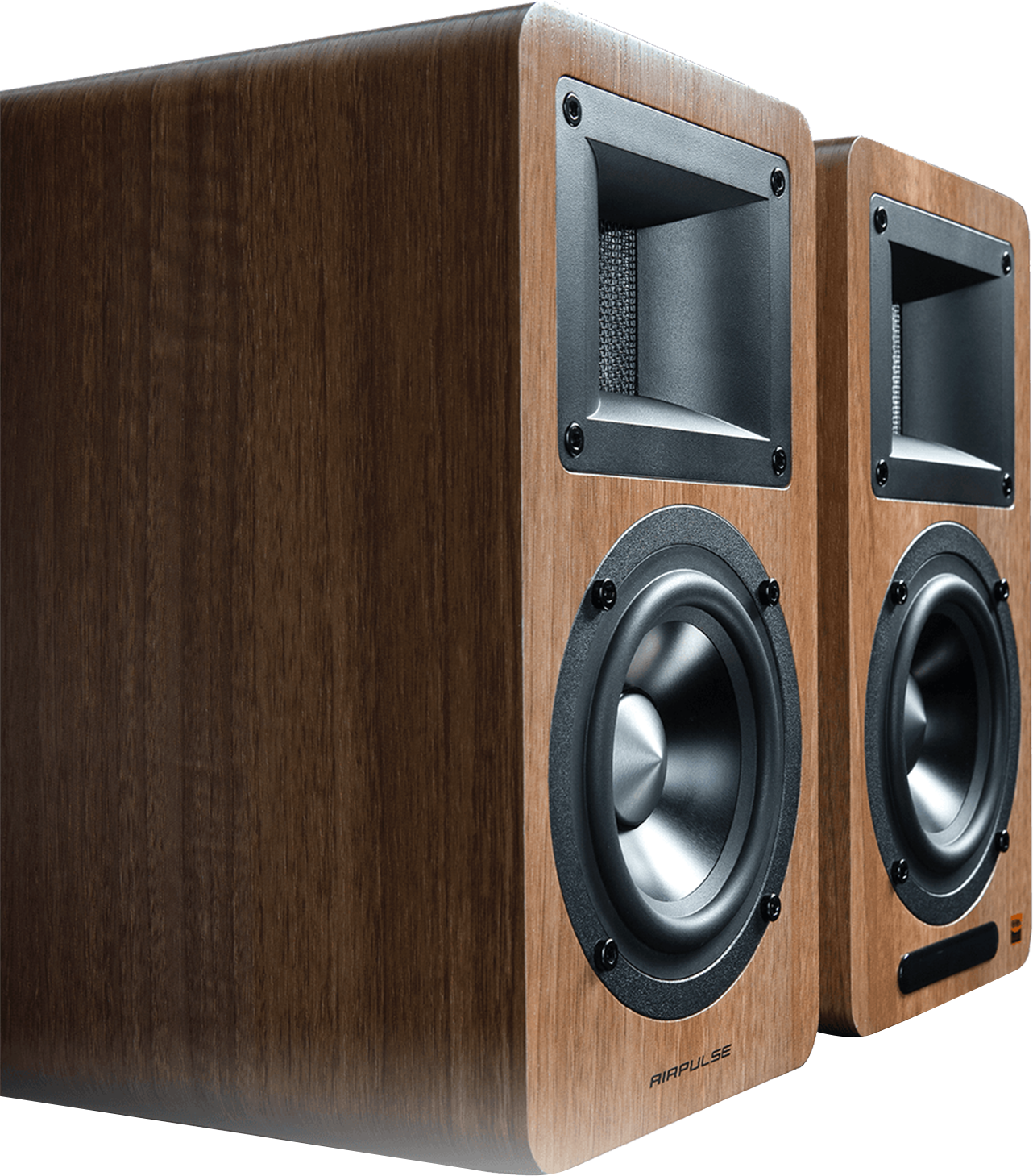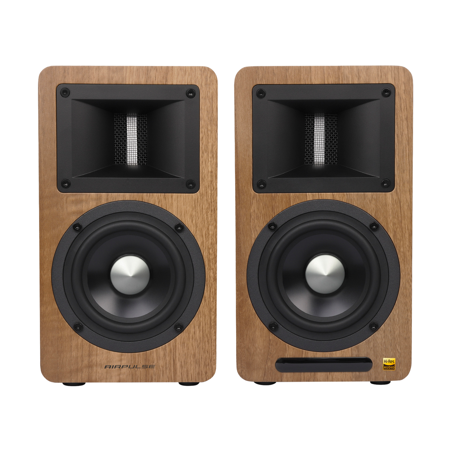 Airpulse A80 active bookshelf speaker system is a perfect combination of uniquely designed conventional loudspeakers and digital systems of XMOS. It supports Hi-Res high-quality audio playback and has obtained a Hi-Res official certification. They are housed in an 18-mm thick high-strength MDF cabinet with beautiful walnut finish.