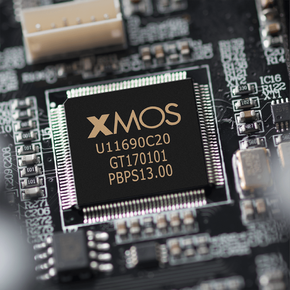 The entire digital system is built on a multi-core signal processor XMOS XU216, a 16-core powerful audio processor based on XMOS xCore200 architect, which is proud of having up to 2000MIPS processing horse-power. The power amplification part is built with 2 pieces of TAS5754 Class-D amplifier from Texas Instrument. With very low output jitter, the unpacked audio signal can be delivered to the XMOS processor with zero loss.