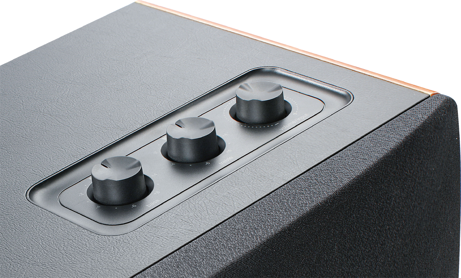 Three top-mounted knobs (Bass dial, treble dial, volume control/input selector) allow for simple, accurate control of the treble, bass, and volume/input.
