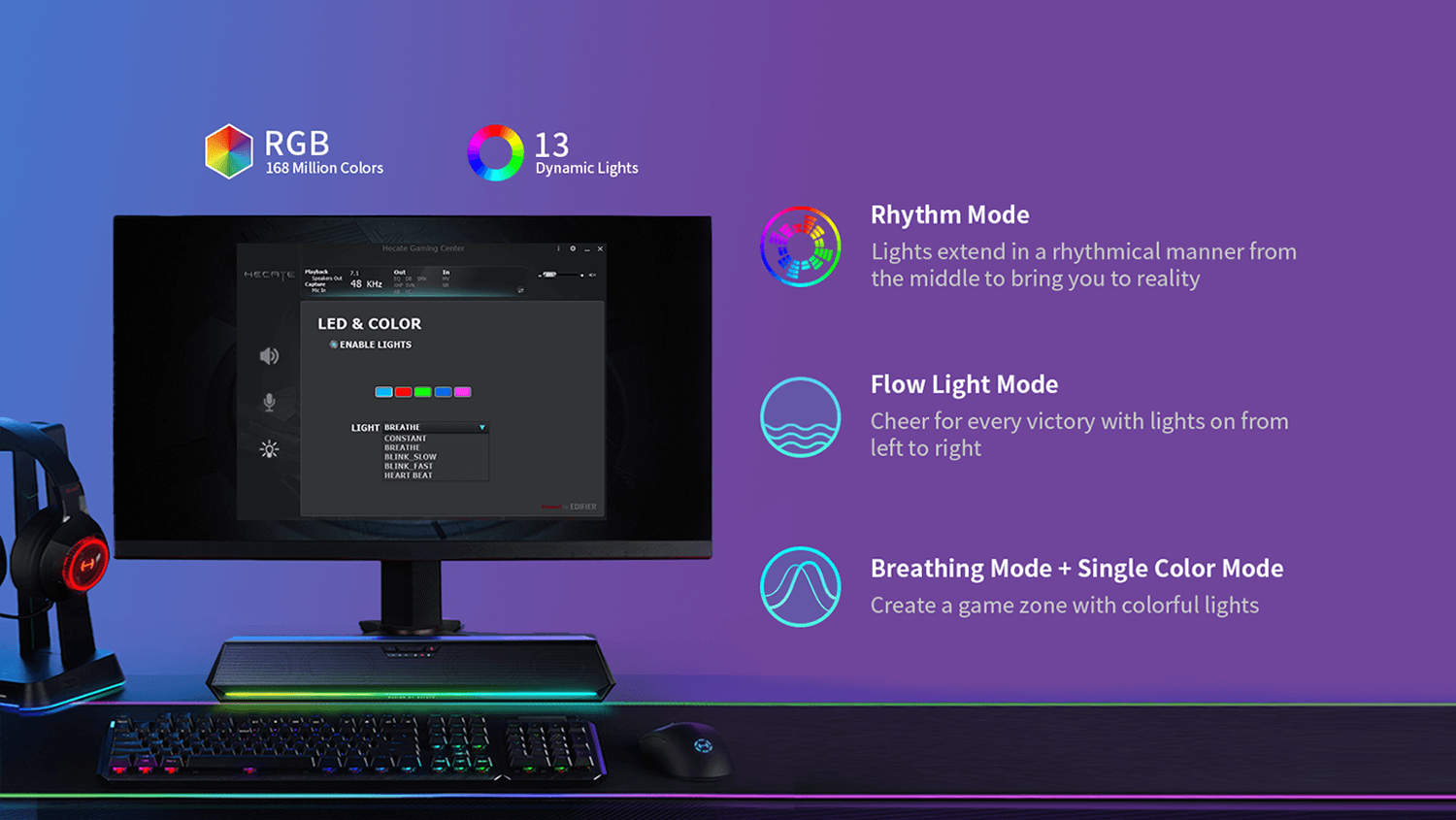 Select your favorite lighting effect using the HECATE software and pair it with your HECATE gaming headset. Create a captivating, immersive atmosphere that enhances your gaming experience with vibrant RGB lighting.