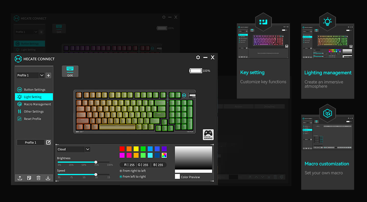 Through HECATE Connect, you can customize dynamic lighting effects/multimedia key/macro editing, etc. Master intricate game controls, all with a single key.
