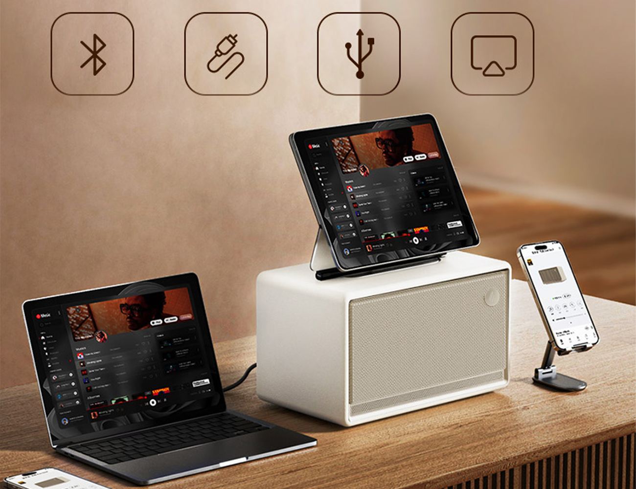 • Hi-Res audio via Wifi, Bluetooth 5.4, USB and AUX input