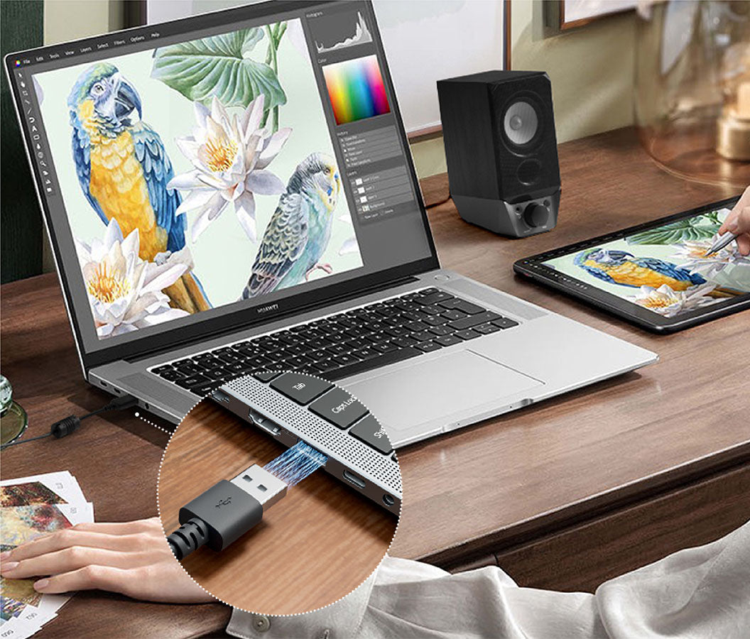 The built-in sound card allows you to connect to your PC via a single USB cable. Say goodbye to multiple wires and keep your workstation organized.