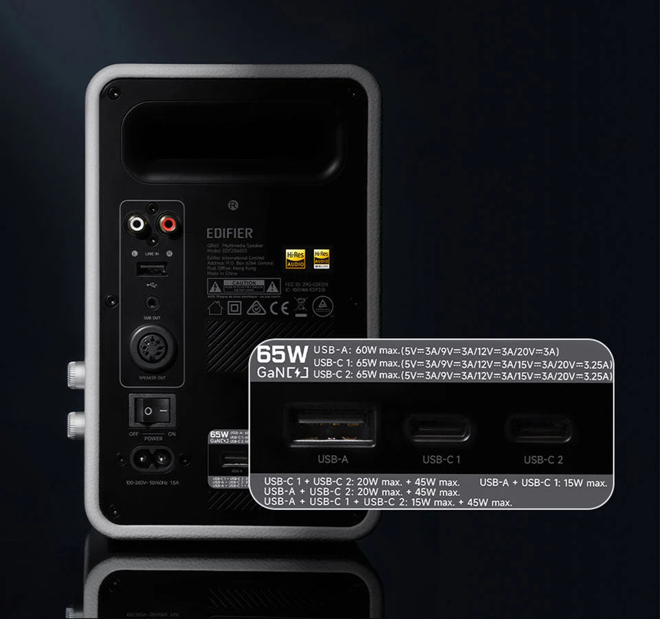 Experience superb audio with the QR65 system, offering high-quality sound at 24bit/96kHz. Dual Tl Class-D digital audio amplifiers ensure precise amplification of high and mid-low frequencies while effectively managing DRC. The speaker boasts USB-A and RCA inputs for superior audio input, and it supports seamless lossless audio streaming at 24bit/96kHz through Bluetooth V5.3 with LDAC technology. Certified for Hi-Res audio and Hi-Res audio wireless quality.
