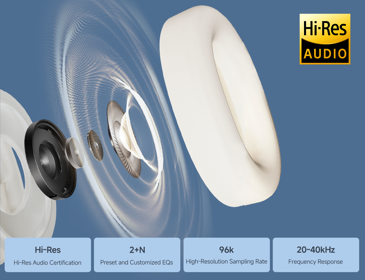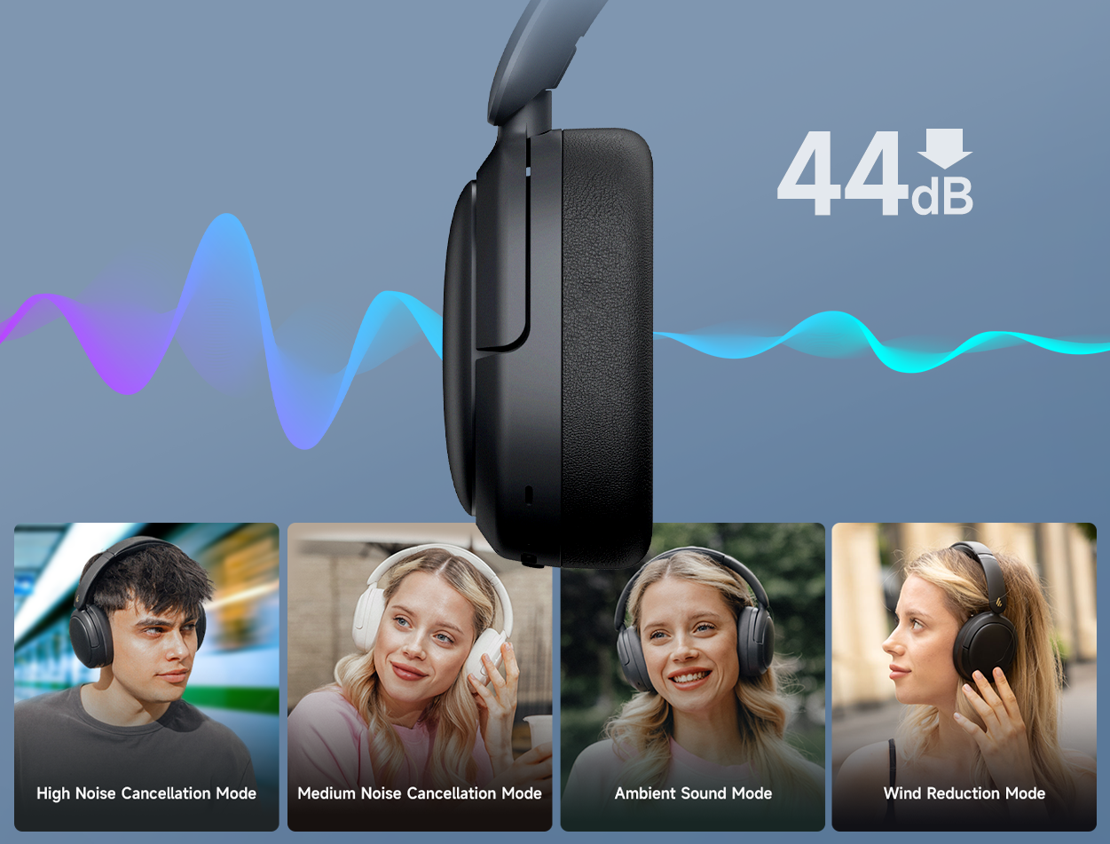 Advanced hybrid active noise cancellation technology, combined with the upgraded full-fit over-ear design, ensures excellent passive noise reduction and achieves a noise reduction depth of up to -44dB, letting you immerse yourself in music anytime, anywhere.